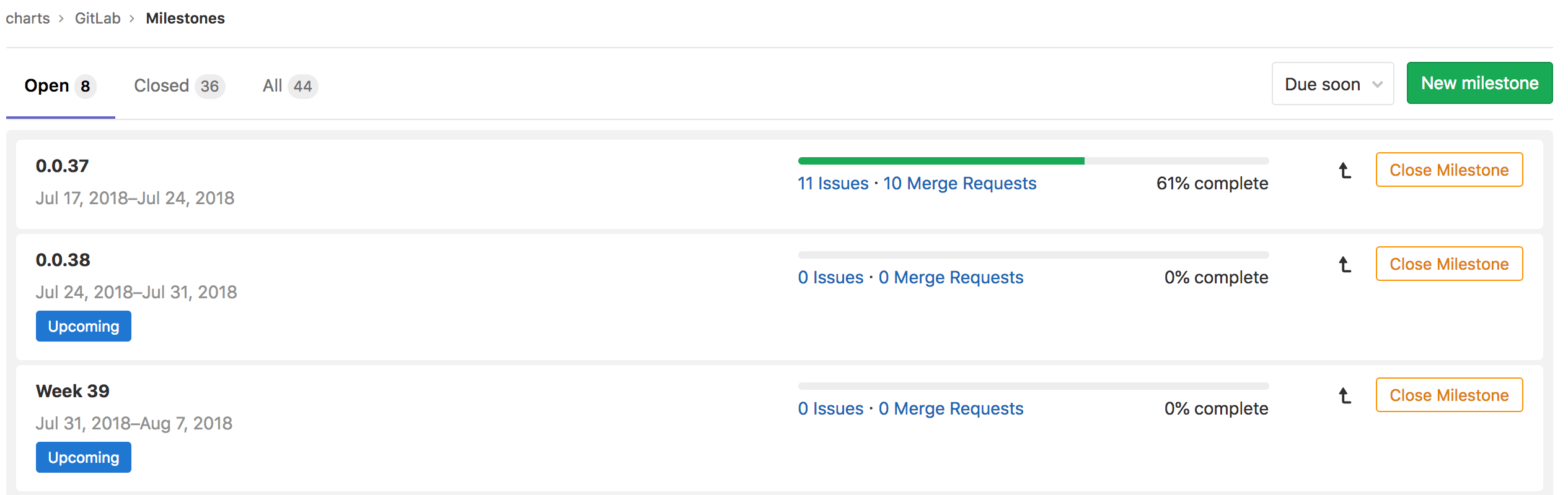 • Upcoming: Show issues or merge requests that have been assigned the open milestone and has the nearest due date in the future.